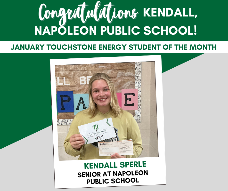 In strides to support local students and schools, KEM Electric Cooperative is awarding a monetary donation to students across the service territory through our Touchstone Energy Cooperative® Student of the Month program. Kendall Sperle was named the January Touchstone Energy Student of the Month. She is the daughter of KEM Electric members, Chris & Jamie Sperle. Kendall is a senior at Napoleon Public School. She is active in many activities throughout the school and community, including a mentorship program.